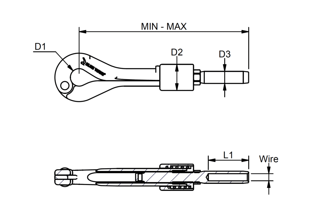 | F | R | W | M | ART. NO. | WIRE | THREAD | D1 | D2 | D3 | L1 | MIN - MAX | KG/100 |